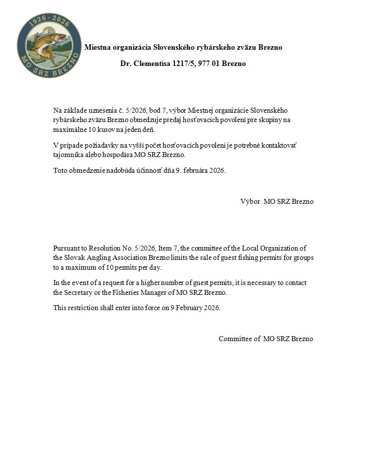 Ceny sezónnych povolení na vody Mo SRZ Brezno